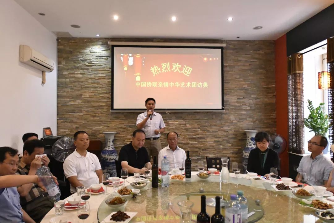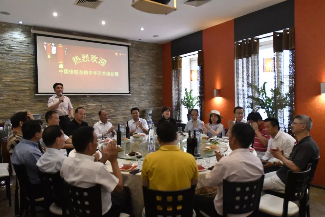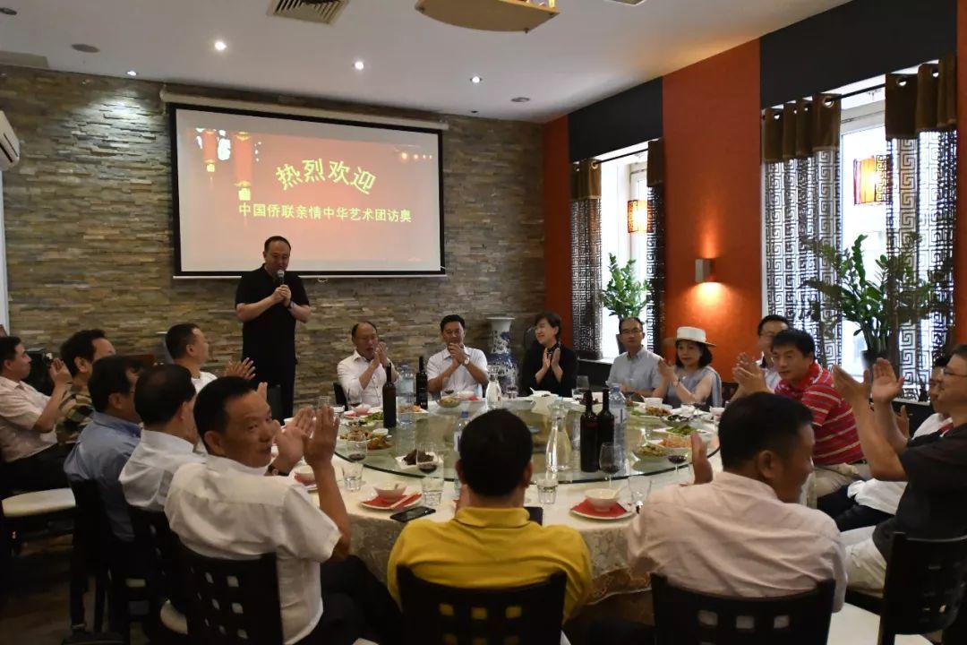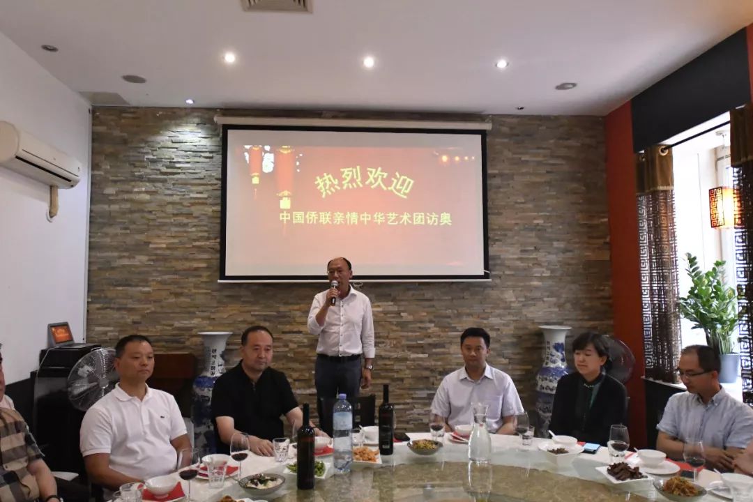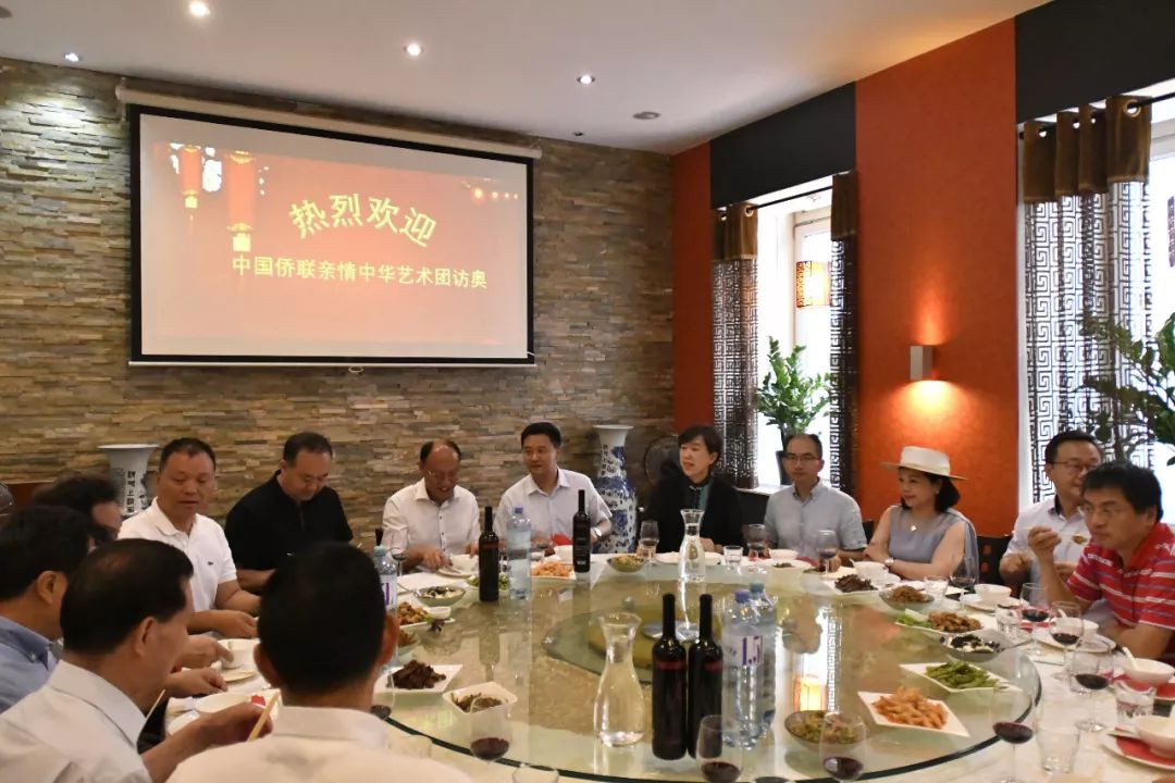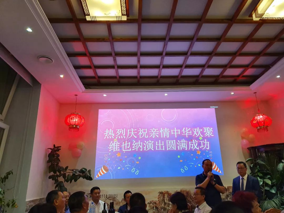 在演出前一天由当地侨团组织了隆重的接风宴,接风宴于7月4日晚19:30在维也纳九鼎楼饭店隆重举行,中国侨联文化交流部部长、“亲情中华”艺术团团长刘奇,副团长齐红,中国驻奥地利大使馆余锋参赞,温州市鹿城区经济促进会王会长一行,各侨团代表和艺术团成员参加了晚宴。