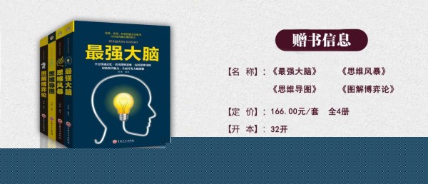 一、公益赠书:活动将面向中国儿童免费赠送脑忆开发系列著作10万套。该系列著作共4本,价值166元/套,分别为《最强大脑》、《思维导图》、《思维风暴》,《图解博弈论》,均为脑忆开发系列正版畅销书,是一套让可以伴随孩子一生学习和未来工作,且终生受益的著作。