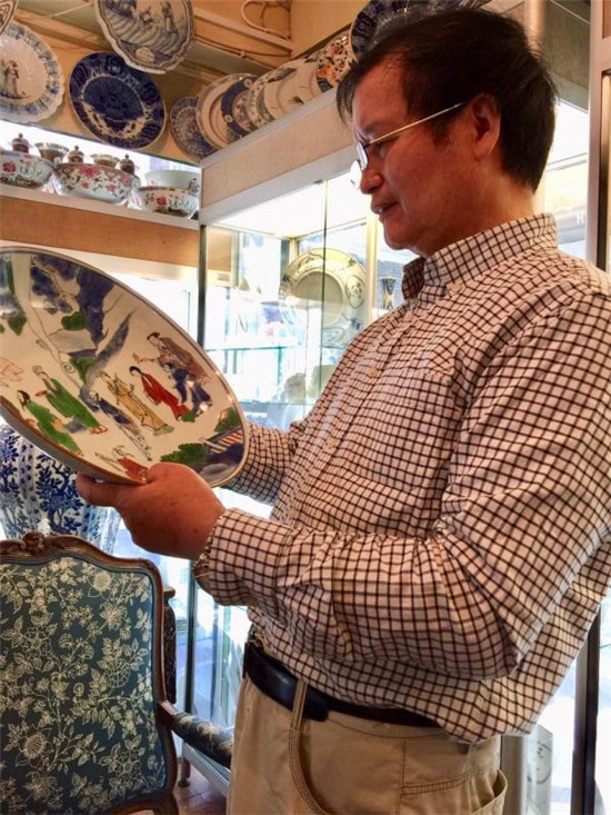 洪加祥在英国伦敦一家古玩店,鉴定康熙五彩人物盘。
